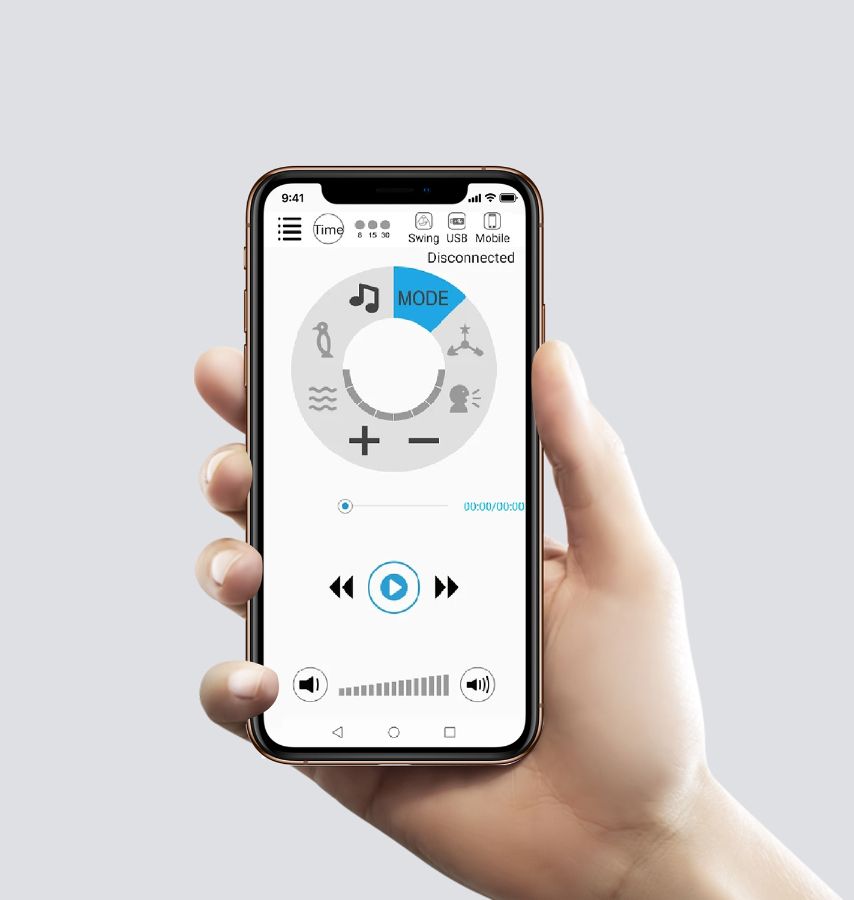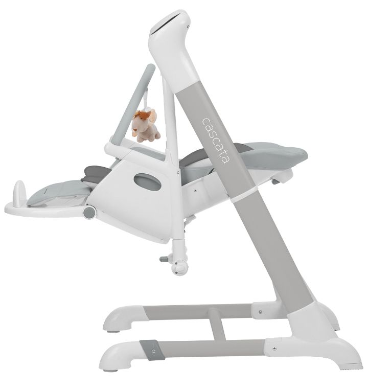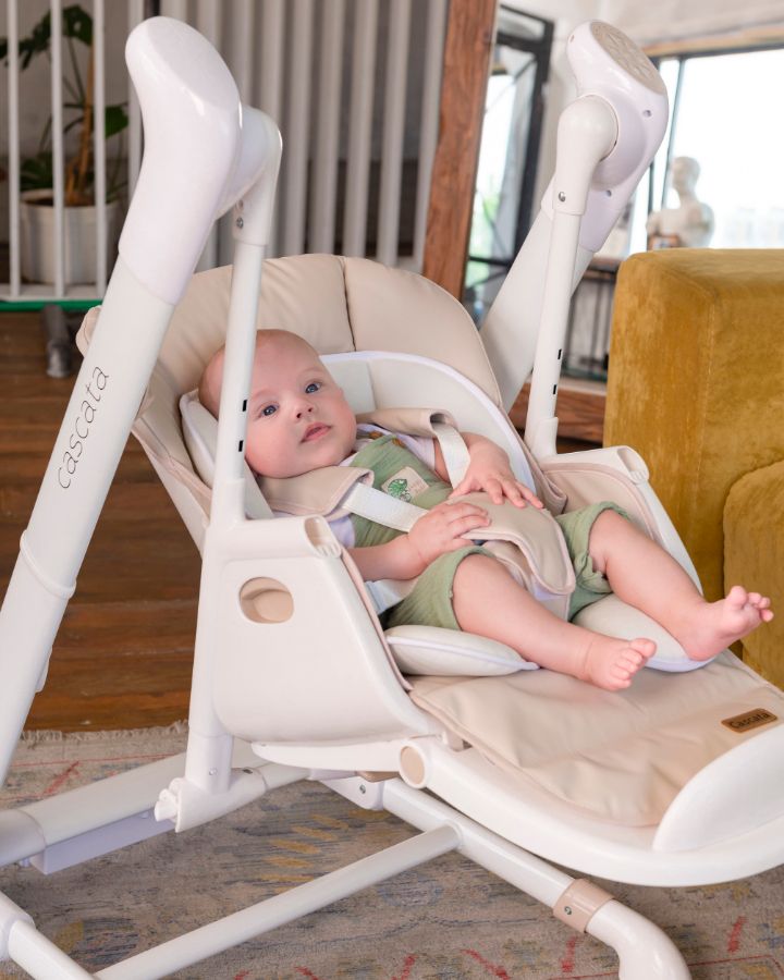 Музыкальное сопровождение на выбор: пение птиц и журчания воды, умиротворяющие детские мелодии и возможность подключения внешнего USB-накопителя с вашей музыкой. Cascata управляется с помощью приложения для телефона, или панели управления. QR-код для установки приложения можно найти в инструкции. Бесшумный маятниковый механизм позволяет укачивать ребенка в стульчике, как в обычных электронных качалках. Про развитие малыша позаботится музыкальный модуль с приятными мелодиями и дуга с красивыми мягкими игрушками. Так же есть функция обнаружения активности движения, которая автоматически включает медленный режим покачивания качели с музыкой на средней громкости.